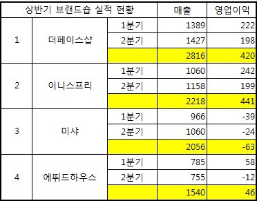 더페이스샵·이니스프리 투톱 체제 유지, 미샤·에뛰드 부진 이어져