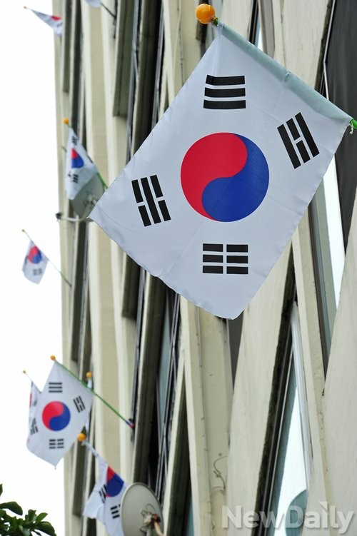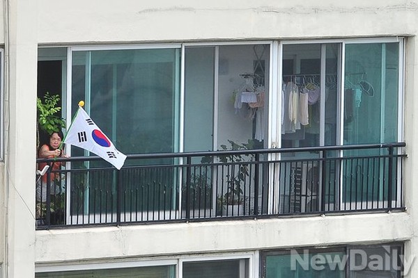 건국절이자 광복절을 하루 앞둔 14일 오전 서울 강남구 대치동에 위치한 쌍용 1차 아파트 단지 주민들이 [태극기 달기 운동]을 벌였다.