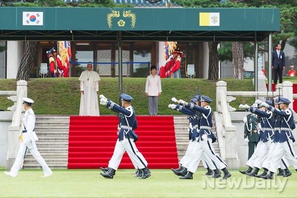 박근혜 대통령과 프란치스코 교황 14일 오후 청와대에서 열린 공식 환영식에서 의장대의 사열을 지켜보고 있다.