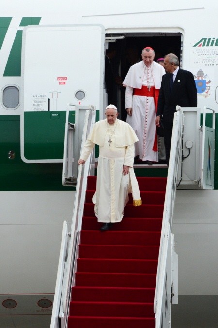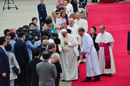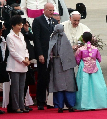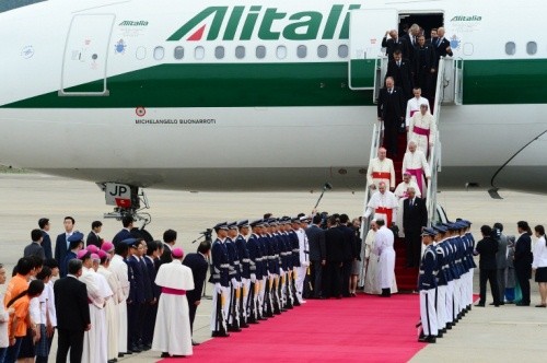 14일 오전 10시 30분 알이탈리아 편으로 서울공항에 도착한 프란치스코 교황은 기내로 올라온 주한 교황대사 오스발도 파딜랴 대주교와 최종현 외교부 의전장의 안내를 받아 미리 도열해 있던 환영단 앞에 내렸다.