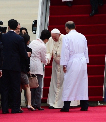 트랩을 천천히 걸어내려와 한국 땅을 밟은 교황은 계단 아래에서 기다리고 있던 박근혜 대통령과 정답게 인사를 나누며 간단한 대화를 주고 받았다.박근혜 대통령 : "교황 방한을 계기로 국민들에게 따뜻한 위로가 전해지고 분단과 대립의 한반도에 평화와 화해의 시대가 열리길 바랍니다."