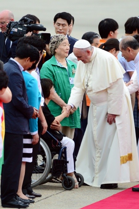 이후 통역 담당 신부가 '환영 영접단'을 소개하자 교황은 이들과 일일이 눈을 마주하며 인사를 나눴다.