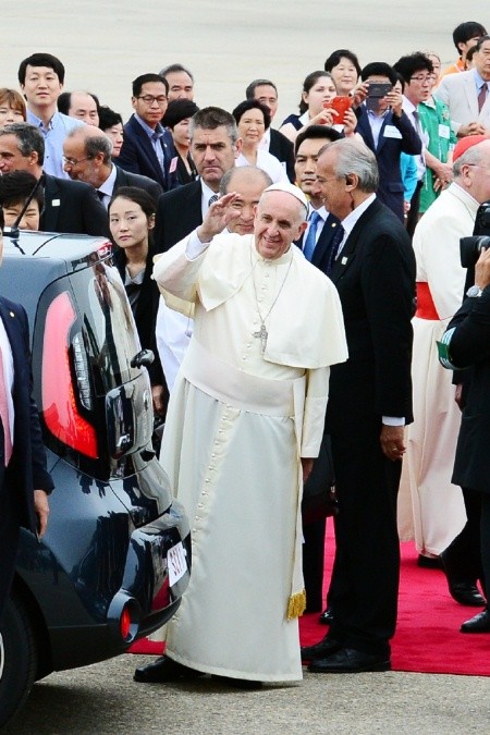 간단한 환영행사를 마친 뒤 검은색 기아 '쏘울' 차량에 통역 신부와 동승한 교황은 주변에 있는 사진 기자들을 향해 손을 흔드는 포즈를 취하기도. -