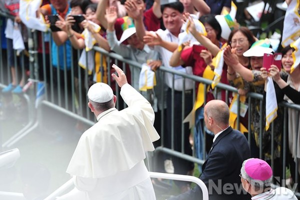 기상악화로 헬기 대신 KTX로 이동한 교황은 대전교구장 유흥식 주교와 권선택 대전광역시장의 영접을 받고 이동해 카퍼레이드로 자리에 참석한 5만여명의 신자와 만났다.