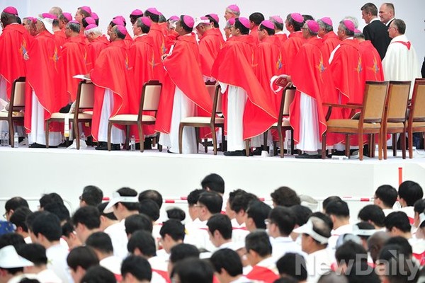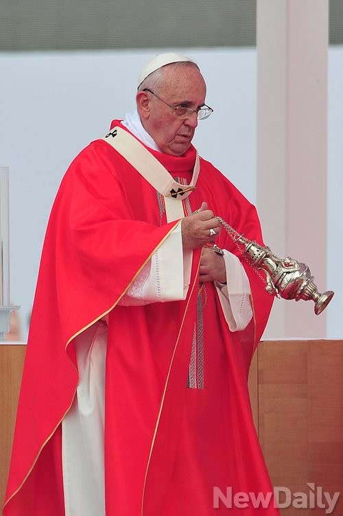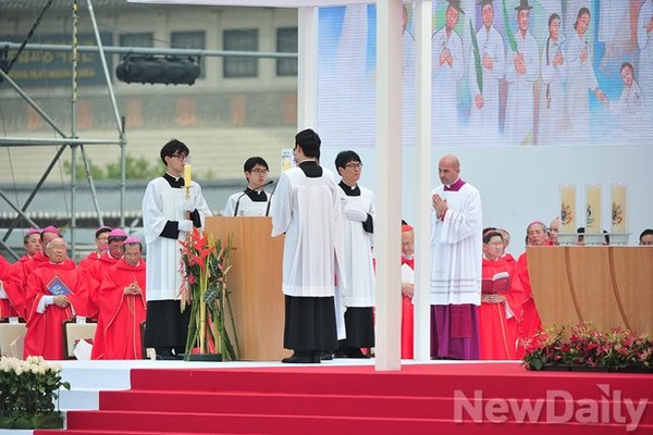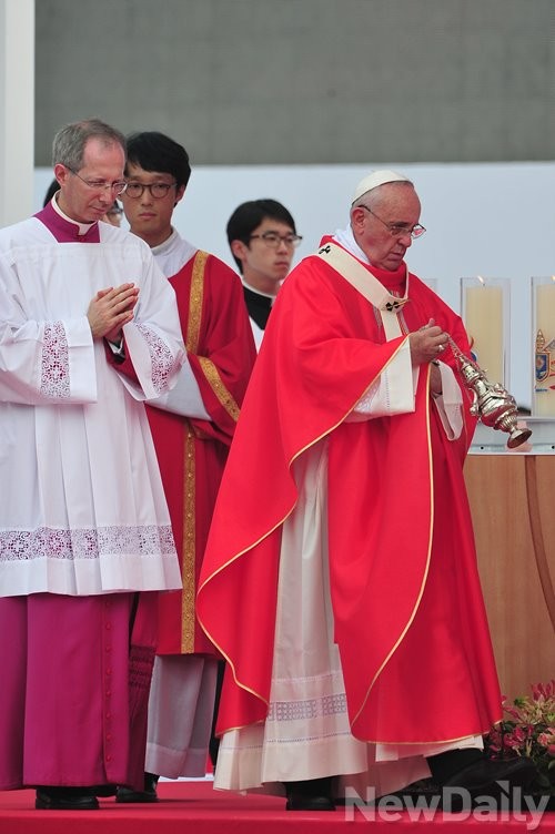 이날 교황은 시청에서 광화문 앞까지 퍼레레이드 하며 전국에서 모인 100만여명의 신자들과 인사한 뒤 광화문 삼거리 북측광장에 설치된 제대에서 시복미사를 집전했다.