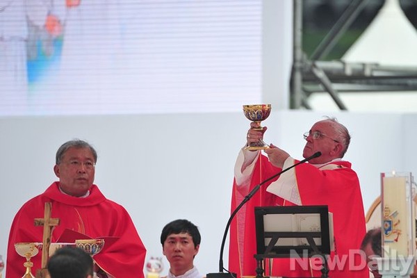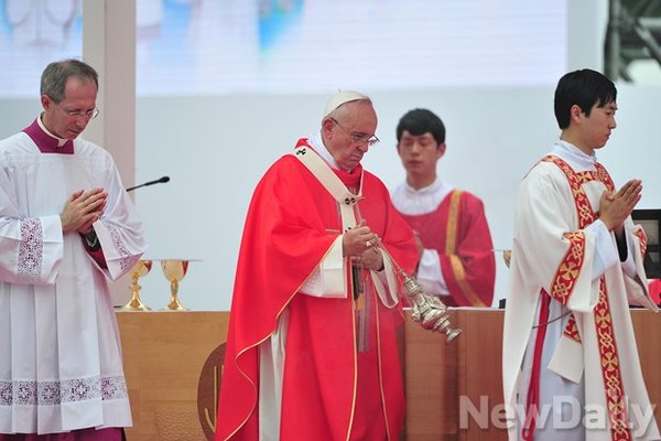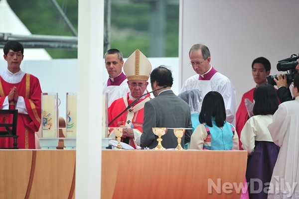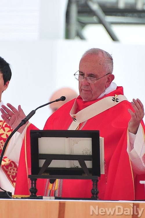이날 교황은 시청에서 광화문 앞까지 퍼레레이드 하며 전국에서 모인 100만여명의 신자들과 인사한 뒤 광화문 삼거리 북측광장에 설치된 제대에서 시복미사를 집전했다.