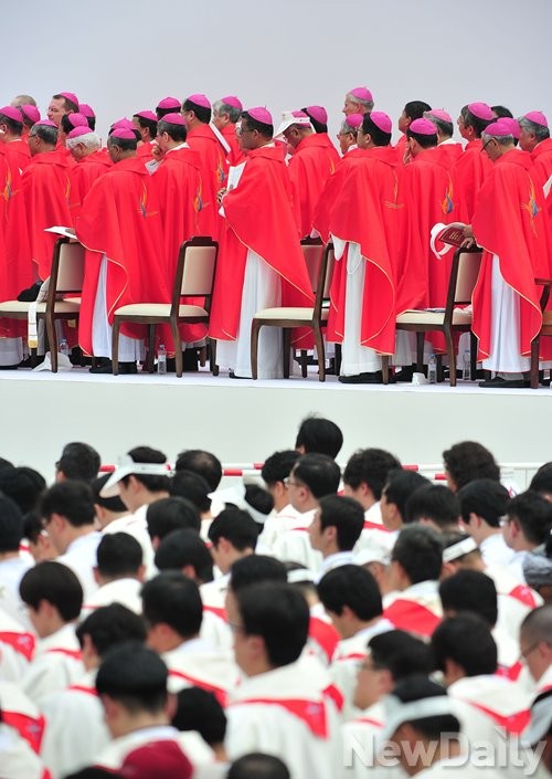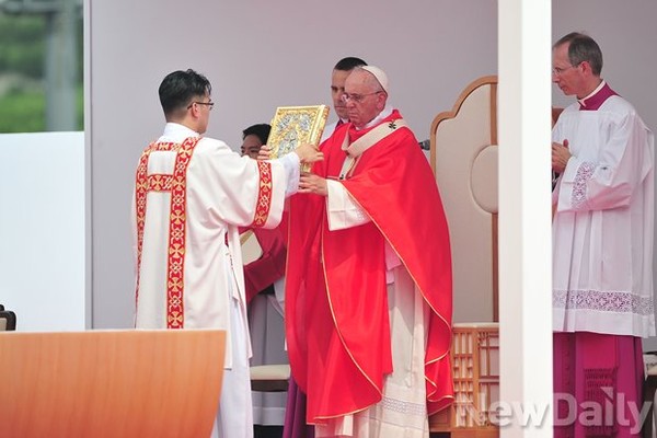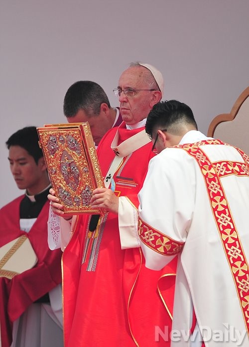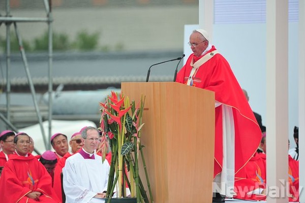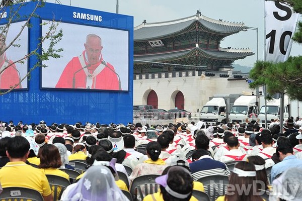 이날 교황은 시청에서 광화문 앞까지 퍼레레이드 하며 전국에서 모인 100만여명의 신자들과 인사한 뒤 광화문 삼거리 북측광장에 설치된 제대에서 시복미사를 집전했다.