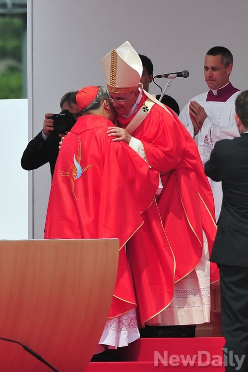 이날 교황은 시청에서 광화문 앞까지 퍼레레이드 하며 전국에서 모인 100만여명의 신자들과 인사한 뒤 광화문 삼거리 북측광장에 설치된 제대에서 시복미사를 집전했다.