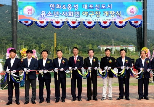 16일 오전 9시 충남 홍성군 홍북면 내포신도시 체육공원에서 '한화&홍성 내포 유소년·사회인 야구장' 개장식이 열렸다.이날 개장식에서는 안희정 충남도지사, 김석환 홍성군수. 정승진 한화이글스 대표이사 등 관계자들이 참석한 가운데 감사패 증정, 충남도지사의 시구, 홍성군과 서산시 리틀 야구팀의 친선 경기 등 다양한 이벤트가 진행됐다.한화&홍성 내포 유소년·사회인 야구장은 한화이글스에서 은퇴한 박찬호가 연봉 5억 3천만원을 기부해 화제를 모은 바 있다. 지난 7월 준공된 내포 야구장은 한화 이글스가 야구장 건립을 맡았다.야구 저변 확대와 유소년 야구 발전을 위해 꾸준히 노력해 온 한화이글스는 '한화&홍성 내포 유소년·사회인 야구장'을 홍성군에 무상 기증하는 등 앞으로도 지역 야구 발전을 위해 다양한 사회공헌활동을 펼칠 예정이다.[사진 = 한화 이글스 제공]