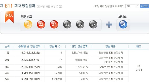 2014년 8월 16일 실시된 제611회 나눔로또 1등 당첨번호는 '2, 22, 27, 33, 36, 37'이며, 2등 보너스 번호는 14번이다.이번 로또 611회차 추첨 결과 1등 당첨자는 4명으로 35억270만6157원의 당첨금을 받게 됐다.1등 번호 중개와 보너스 번호를 맞힌 2등은 47명이며, 1인당 4968만3776원씩 지급받는다. 당첨번호 중 5개를 맞힌 3등은 1486명으로 당첨금은 각 157만1425원이다.5만원의 당첨금을 받는 4개의 번호를 맞힌 4등은 7만4589명이며, 5000원의 고정 당첨금을 받는 5등은 125만8998명이 나온 것으로 집계됐다.한편, 이번주 로또611 총 판매금액은 574억1107만9000원이다.[로또611회당첨번호, 사진=로또 홈페이지 캡처]
