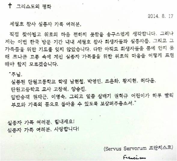 직접 찾아뵙고 위로의 마음 전하지 못함을 송구스럽게 생각합니다. 그러나 저는 이번 한국 방문 기간 내내 세월호 참사 희생자들과 실종자들, 그리고 그 가족들을 위한 기도를 잊지 않았습니다. 다만 아직도 희생자들을 품에 안지 못해 크나큰 고통 속에 계신 실종자 가족들을 위한 위로의 마음을 어떻게 표현해야 할지 모르겠습니다.