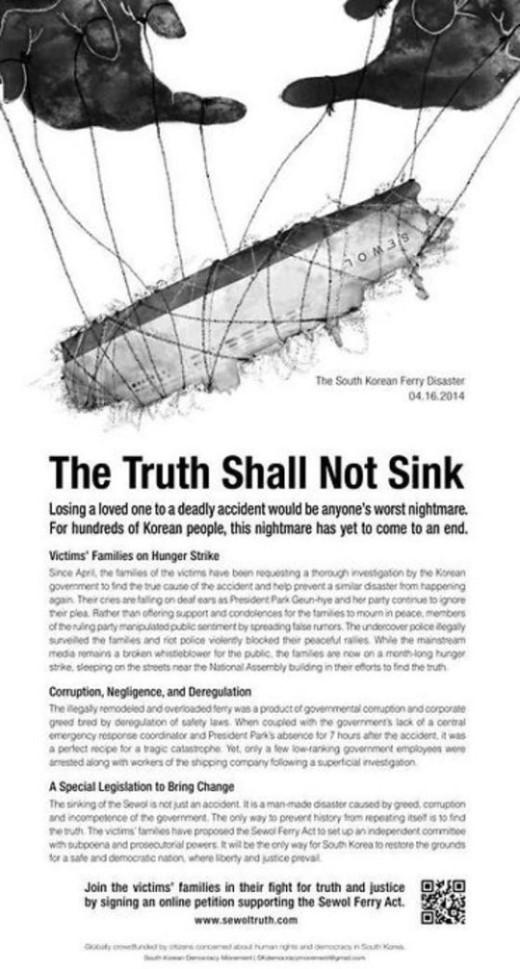 광고에는 이 같은 문구와 함께 '거대한 손'이 어지럽게 줄이 감긴 세월호를 '좌지우지'하고 있는 듯 한 그림이 그려져 있다. 보이지 않는 손, '빅 브라더'를 상징하는 것으로 보인다.