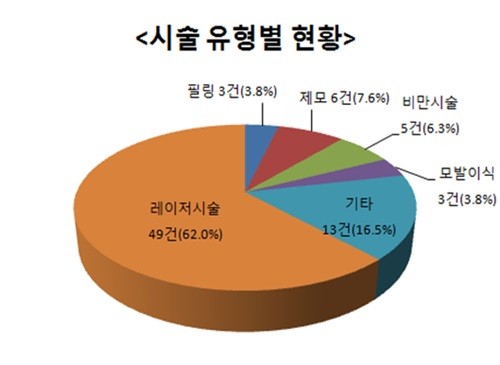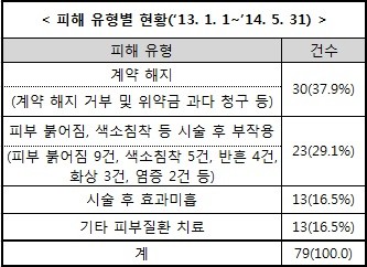 하OO(여, 40대, 경기도 부천시) 씨는 잡티, 기미의 개선을 위해 2011년 11월 K의원에 내원해 상담 후 IPL 레이저 시술 5회를 받았으나, 시술 후 색소 침착이 발생했다. 결국 다른 병원에서 진료를 받았으며, 시술 후 기존의 색소가 심화돼 색소침착으로 발전된 상태여서 향후 주기적인 레이저 토닝 등의 시술이 필요하다는 소견을 받았다.유OO(여, 30대, 서울시 강남구) 씨는 2013년 7월 피부결 개선을 위해 A의원에 내원해 상담 후 피부결 개선, 잡티 완화, 수분 유지 등의 효과가 있다는 이브아르필러 주입술 3회를 권유받고 49만원을 지불했다. 2회 시술을 받은 상태에서 효과 미흡으로 남은 1회 시술에 해당하는 비용의 환급을 요구했으나 거절당했다.<한국소비자원>은 최근 피부과 미용시술 관련 피해가 2011년 이후 매년 증가하고 있으며 올해 5월까지 최근 3년간 총 146건의 피해가 접수됐다고 밝혔다.작년부터 올해 5월까지 접수된 79건의 피부과 미용시술 피해를 분석한 결과, 계약해지 거부 및 위약금 과다 청구 등 [계약 해지] 관련 피해가 30건(37.9%)으로 가장 많았다.[소비자분쟁해결기준]에 따르면 미용을 목적으로 한 피부과 시술을 계약했다가 해지했을 경우, 치료 횟수에 따른 금액과 일부 위약금을 공제한 후 환급을 받을 수 있다.하지만 일부 피부과 병·의원에서는 계약 당시에 체결한 금액은 이벤트 할인가격이었다며 해지 시 정상 시술비를 적용해 환급액을 정산하거나 아예 환급 자체를 거부하고 있는 것으로 나타났다.이외에도 시술 받은 후 피부가 붉어지거나 색소가 침착하는 등 [시술 후 부작용]이 23건(29.1%), [시술 후 효과 미흡]이 13건(16.5%)으로 나타났다.시술 유형별로는 [레이저 시술] 관련 피해가 49건(62%)으로 다른 시술보다 압도적으로 많았다.피해자 대다수는 20~30대(48명, 60.7%), 여성(66명, 83.5%), 수도권(65명, 82.3%) 거주자였다.지역별로는 서울에 소재한 병·의원(47건, 59.5%)에서 피해가 가장 많았는데 특히 강남·서초 소재 병·의원에서 발생한 피해가 서울지역 피해의 59.6%(28건)를 차지했다.그러나 이러한 피해에 대해 병․의원의 처리 거부나 의료진 과실 입증이 어려워 환급이나 배상 등 합의가 이루어진 경우는 42건(53.2%)에 불과했다.이에 한국소비자원은 소비자 피해 예방을 위해 [소비자분쟁해결기준]상의 환급 규정을 피부과 병·의원들이 명확히 준수하도록 관계부처에 협조를 요청하겠다고 밝혔다.아울러 소비자는 피부 미용시술을 받고자 할 경우 자신의 피부상태에 대해 전문의와 충분히 상담한 후 시술 여부를 결정할 것, 시술의 효과와 부작용 등에 대해 자세히 설명을 듣고 충동적으로 계약하지 않도록 주의할 것, 시술을 시행할 의사가 피부과 전문의인지, 시술 경험은 어느 정도인지 반드시 알아볼 것, 시술의 종류 및 횟수에 따른 정확한 금액과 환급 기준을 확인한 후 계약할 것을 당부했다.피부과 미용시술 관련 피해가 발생한 경우, 진료기록부 및 시술 전·후 사진 등 입증자료를 확보해 소비자상담센터(국번없이 1372)를 통해 도움을 요청할 수 있다.[사진 = 한국소비자원]