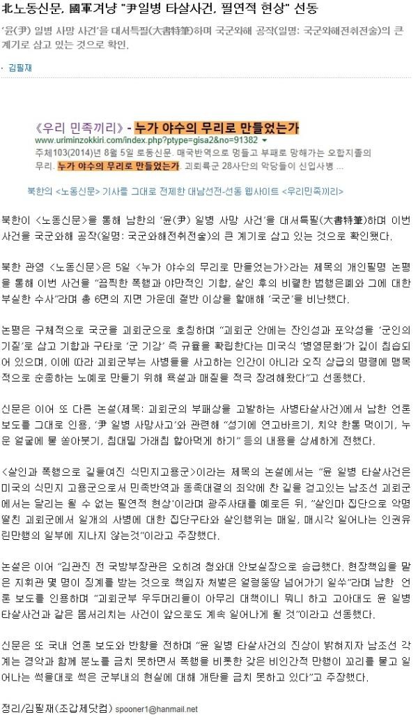 일례로 범민련(利敵단체) 前 미주국장 출신의 한호석은 지난 11일자 칼럼(제목: 2014년 8월 이후 북의 마지막 선택)에서 "북에서 말하는 ‘조국통일대전’은 피를 적게 흘리는 ‘특수한 전쟁’"이라며 "'적군(국군)와해공작'을 전개하고 있다"고 밝혔다.