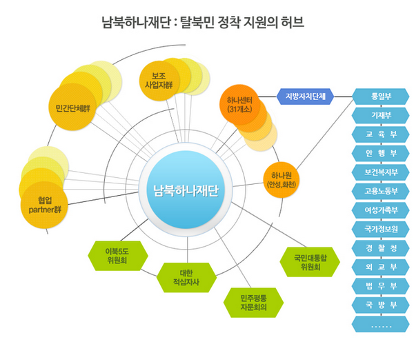 ▶ 이러한 과정을 거쳐 '남북하나재단'이라는 별칭이 도출됐다. 2014년 2월 20일 개최된 재단 이사회에서 의결됐다. 통일부 장관의 최종 승인을 받아 2014년 3월부터 재단의 법률 명칭인 북한이탈주민지원재단과 함께 사용하고 있다.