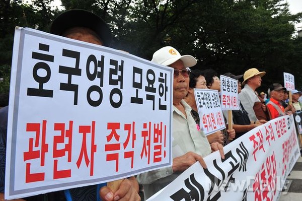 20일 오후 서울 어버이연합은, 사건이 벌어진 서울 동작 국립현충원 앞에서 규탄집회를 열고,[김정은 조화] 반입을 허락한 현충원장 등 정부관계자들 사퇴를 요구하고 있다.