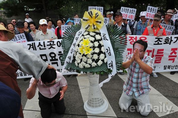 20일 오후 서울 어버이연합은, 사건이 벌어진 서울 동작 국립현충원 앞에서 규탄집회를 열고,[김정은 조화] 반입을 허락한 현충원장 등 정부관계자들 사퇴를 요구하고 있다.