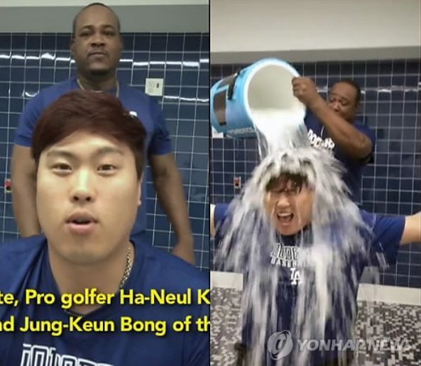 루게릭병 환자를 돕기 위한 'ALS 아이스 버킷 챌린지'에 미 프로야구 LA 다저스의 류현진(27)도 동참했다.