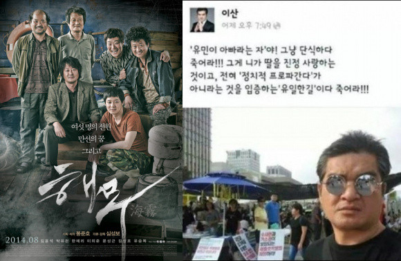 영화 '해무'에 출연한 단역배우 정대용(50)이 이산 막말에 동조한 것에 이어 작품까지 보이콧 논란에 휘말렸다.앞서 배우 이산은 자신의 SNS를 통해 세월호 특별법 제정을 위해 단식 중인 '유민이 아빠' 김영오씨, 가수 김장훈, 배우 문성근 등을 향해 막말을 던진 사실이 알려지며 논란을 일으켰다.이산은 지난 22일 자신의 페이스북에 "유민이 아빠라는 자야, 그냥 단식하다 죽어라. 그게 네가 딸을 진정 사랑하는 것이고, 전혀 '정치적 프로파간다'가 아니라는 것을 입증하는 유일한 길이다. 죽어라"라고 폭언을 퍼부었다.'유민이 아빠'는 세월호 참사로 딸을 잃은 안산단원고 학생 고(故) 김유민의 아버지인 김영오 씨를 지칭한다. 김영오 씨는 세월호 특별법 제정을 촉구하며 42일째 단식 투쟁을 벌이다 건강 악화로 지난 22일 병원으로 옮겨졌다.그런데 영화 '해무'에서 조선족 역으로 잠깐 얼굴을 비춘 배우 정대용이 "황제단식"이라는 댓글을 남겨 논란이 일고 있다. 그러면서 영화 '해무에' 불똥이 뛰었다. 일각에서는 이산의 막말에 동조 댓글을 올린 정대용이 출연한 '해무'를 보지 말자는 '보이콧'까지 주장하고 나선 것.하지만 '해무' 제작자인 봉준호 감독은 '유민 아빠'를 위한 릴레이 단식에 참가했으며, 영화에서 열연을 펼친 문성근 역시 단식장에서 하루를 보내기도 했다. 이에 네티즌들은 '해무' 보이콧 주장은 "너무 심하다"는 의견을 제기하고 있다.[정대용 '황제단식' 댓글 논란, 사진=영화 '해무' 포스터/이산 SNS 캡처]