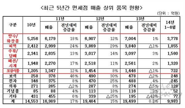 인천국제공항사가 새누리당 이노근 의원(국회 국토교통위원회)에 제출한 [최근 5년간 인천공항 면세점 내 전체 매출]에 따르면 면세점 상위품목 매출은 총 8조 488억 원으로, 그 중 향수 · 화장품이 전체 매출 중 약 36%를 차지하며 5년 연속 1위를 굳건히 지키고 있었다.