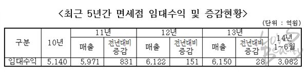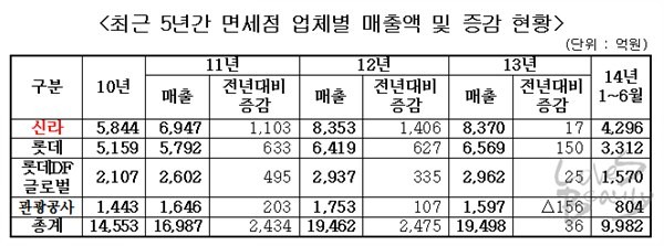 또한 최근 5년간 인천공항 면세점 업체별 매출 총액은 8조 482억 원으로, 2013년엔 전년대비 36억원 증가한 1조 9498억원을 기록했다.