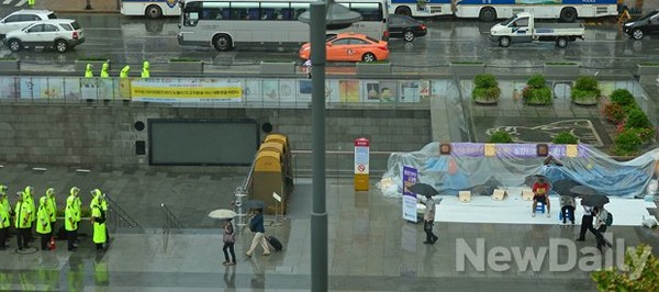 [통합진보당 당원 5,000명 동조단식] 3일째를 맞은 26일 오후 서울 광화문광장 통합진보당 단식장에 비가 내리자 단식을 이어가던 당원들이 비를 피해 단식장이 한산한 모습이다.