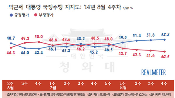 세월호 정국을 일정부분 극복했다는 평가가 나온다.<리얼미터> 8월4주차 주간집계에 따르면