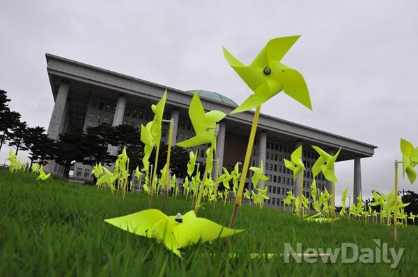 3일 오후 여의도 국회의사당에서 흐린 날씨 속에 세월호 희생자들을 추보하기 위해 설치해 놓은 바람개비가 돌고 있다. 한편 국회는 이날 본 회의를 열고 철도 부품 제작업체로부터 금품을 받은 혐의로 구속영장이 청구된 새누리당 송광호 의원 체포 동의안에 대해 표결할 예정이며 각종 민생 법안은 세월호 특별법 제정을 둘러싼 여야 교착으로 본 회의에 상정되지 못할 것으로 보인다.