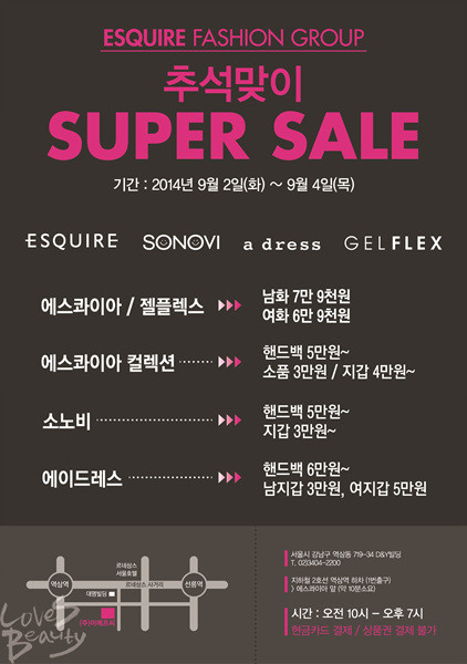 토털 패션 기업 <이에프씨(대표 정휘욱)>가 한가위를 맞아 오는 4일까지 대표 브랜드를 최대 80% 할인 판매하는 [추석 맞이 할인 대잔치]를 진행한다.이번 행사는 역삼동 이에프씨 본사(D&Y빌딩)에서 진행되며 대표 슈즈 브랜드 <에스콰이아>, 스타일리시 컴포트 슈즈 브랜드 <젤플렉스>, 고감도 핸드백 브랜드 <에스콰이아> 컬렉션, 일러스트 패션 잡화 브랜드 <소노비>를 비롯해 홍승완 디자이너의 감성 잡화 브랜드 <에이드레스>까지 총 5개 브랜드가 참가한다.인기 슈즈 브랜드 에스콰이아, 젤플렉스는 여성화를 6만 9000원대, 남성화를 7만 9000원대 균일가로 판매한다.이와 함께 감성 디자이너 브랜드 에이드레스의 핸드백은 6만 원대부터, 남성·여성 지갑은 각각 3만원~5만원대에 판매한다.또한 소노비, 에스콰이아 컬렉션 핸드백은 최저 5만 원대부터 선보이며, 지갑은 최저 3만 원대부터 할인된 가격에 만나볼 수 있다.이와는 별도로 에스콰이아 컬렉션 소품류는 3만 원대에 제공된다.[사진출처 = 이에프씨]
