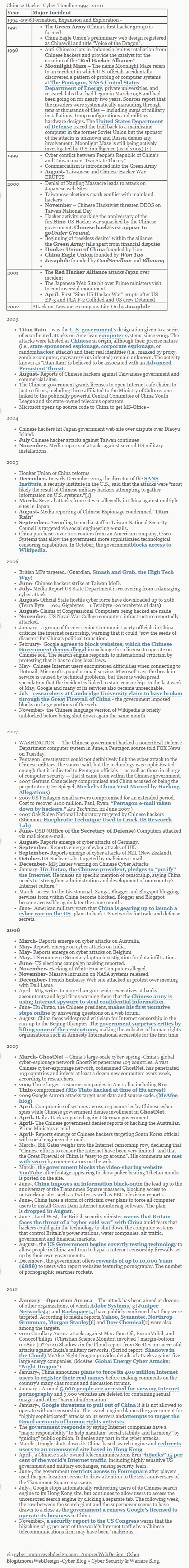 중국에는 현재 100만 명에 달하는 민간 해커들이 활동 중이다. 극단적 애국심으로 무장한 일부 중국 해커들의 경우 매우 공격적이고 무차별적인 해킹을 감행해왔다. 그러나 중국 정부는 이들 해커들이 자국 사이트를 공격하지 않는 한 처벌하지 않는 태도를 보이고 있다.