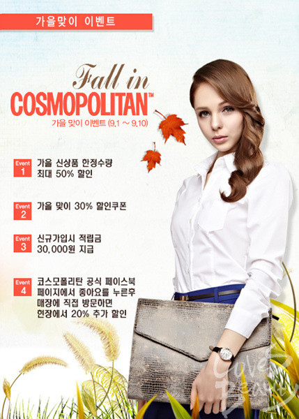 글로벌 패션매거진 라이센스 브랜드 <코스모폴리탄>이 추석 명절을 맞아 가을 신상품 4가지 품목을 최대 50% 할인하는 행사를 진행한다.이번 행사에서는 가을을 맞아 새롭게 출시한 크로커 팔찌 토트백, 크로커 백팩을 50%할인 된 9만 9000원에 만나볼 수 있으며, 사피아노 장지갑이 50% 할인된 8만 9000원에 판매 중이다.또한 가을을 맞아 공식 쇼핑몰에서는 가을 맞이 30% 할인 이벤트도 함께 진행된다.할인 이벤트와 더불어 공식 쇼핑몰 회원가입 유치를 위한 회원 가입 혜택이 주어지는 데 회원 가입 시 현금처럼 사용 가능한 적립금 3만원을 즉시 지급하며, 공식 페이스북 페이지 [좋아요]를 누른 후 매장에 직접 방문하면 현장에서 20% 추가 할인을 받을 수 있다.추석 맞이 할인 이벤트는 추석 연휴가 끝나는 10일까지며, 21명 선착순 판매 시 조기 종료된다.가을 맞이 할인 이벤트는 9월 30일까지 진행된다.[사진 = 코스라인터내셔날]