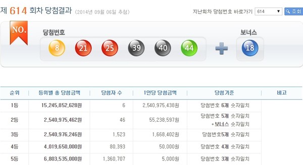 2014년 9월 6일 실시된 제614회 나눔로또 1등 당첨번호는 '8, 21, 25, 39, 40, 44'이며, 2등 보너스 번호는 18번이다.이번 로또 614회차 추첨 결과 1등 당첨자는 6명으로 25억4097만5438원의 당첨금을 받게 됐다.1등 번호 중개와 보너스 번호를 맞힌 2등은 46명이며, 1인당 5523만8597원씩 지급받는다. 당첨번호 중 5개를 맞힌 3등은 1523명으로 당첨금은 각 166만8402원이다.5만원의 당첨금을 받는 4개의 번호를 맞힌 4등은 8만393명이며, 5000원의 고정 당첨금을 받는 5등은 136만707명이 나온 것으로 집계됐다.한편, 이번주 로또614 총 판매금액은 623억197만7000원이다.[로또614회당첨번호, 사진=로또 홈페이지 캡처]