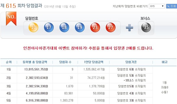 2014년 9월 13일 실시된 제615회 나눔로또 1등 당첨번호는 '10, 17, 18, 19, 23, 27'이며, 2등 보너스 번호는 35번이다.이번 로또 615회차 추첨 결과 1등 당첨자는 9명으로 15억3506만2417원의 당첨금을 받게 됐다.1등 번호 중개와 보너스 번호를 맞힌 2등은 31명이며, 1인당 7427만7214원씩 지급받는다. 당첨번호 중 5개를 맞힌 3등은 1670명으로 당첨금은 각 137만8799원이다.5만원의 당첨금을 받는 4개의 번호를 맞힌 4등은 8만3981명이며, 5000원의 고정 당첨금을 받는 5등은 138만3278명이 나온 것으로 집계됐다.한편, 이번주 로또615 총 판매금액은 590억7237만8000원이다.[로또615회당첨번호, 사진=로또 홈페이지 캡처]