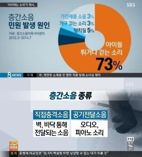 층간소음 민원 1위는 '아이들이 뛰는 소리'였다.15일 환경부와 한국환경공단에서 운영하고 있는 층간소음이웃사이센터에 따르면 지난 2012년 3월 개소 이후 올해 7월 31일 기준으로 이뤄진 총 3만3311건의 민원상담과 7700건의 현장진단서비스 신청이 이뤄졌다.이 가운데 '아이들 뛰는 소리나 발걸음 소리'가 5659건(72.8%)로 층간소음 민원 1위를 차지했다.2위는 353건의 망치질(4.5%)이 올랐으며, 뒤를 이어 가구 끌거나 찍는 행위는 225건(2.9%), 청소기·세탁기 등 가전제품 소리가 198건(2.6%), 악기(1.9%), 문 개폐(1.6%), 급배수(1.3%) 등 순이었다.주거 유형별로는 아파트가 78.7%로 가장 많았고, 연립주택은 11%를 보였다. 또, 거주위치별로는 아래층에서 들어온 민원이 82.5%로 압도적이었으며 위층(13.7%), 옆집(1.6%)이 뒤를 이었다.[층간소음 민원 1위, 사진=SBS 뉴스 영상 캡처]