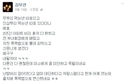 김부선은 14일 "무뿌리 먹는년 따로 있고 인삼뿌리 먹는년 따로 있다더니 2년간 아파트 비리 혼자 다 밝히고 전,부녀회장에게 매맞고 자칫 폭력범으로 몰려 피박쓰고 신문나게 생겼다"며 이번 사건의 중심에 '아파트 비리'가 자리하고 있음을 주장했다.