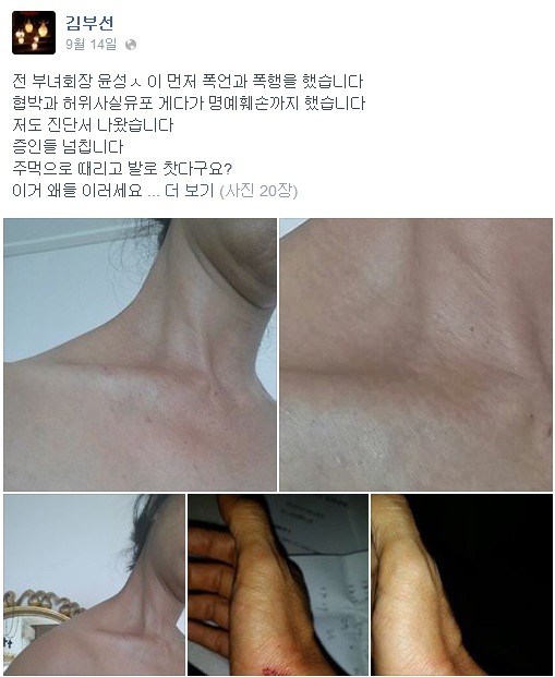 김부선은 "폭력 사건이 발생한 지난 12일, 성동구의 모 아파트 반상회에서 난방 비리에 대한 진실을 주민들에게 폭로하려는 순간, 윤씨 등이 난입해 폭언-폭력을 가하고 (자신의)입을 막은 것"이라며 사실상 자신이 '피해자'임을 역설했다.