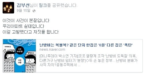 김부선이 링크시킨 기사는 "아파트 같은 단지 내 한집은 난방비가 0원, 다른 집은 폭탄"이라는 내용을 담은 경제 기사였다.이것이 사건의 본질입니다. 우리아파트의 실태입니다. 이걸 고발했다고 저짓들을 합니다.