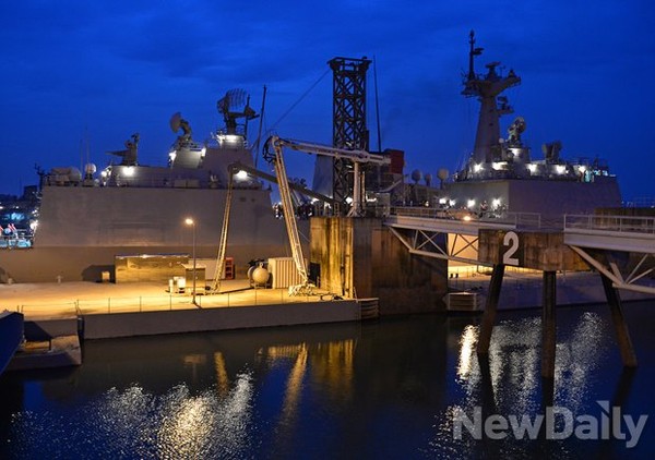 해군 제7기동전단 소속 한국형 구축함 왕건함이 17일 오전 서해상에서 가상으로 NLL을 침범한 적을 격퇴하기 위한 훈련을 위해 출항 준비를 하고 있다.