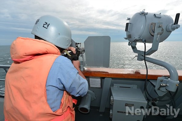 해군 제7기동전단 소속 한국형 구축함 왕건함 소속 한 병사가 17일 오전 서해상에서 가상으로 NLL을 침범한 적을 격퇴하기 위해 총원 전투배치 훈련을 하고 있다.