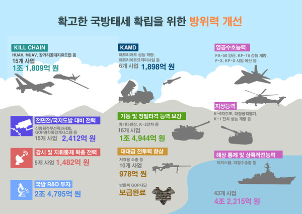 북한의 핵과 미사일 등 대량살상무기를 조기에 포착해 무력화하기 위한 ‘킬 체인(Kill chain)’과 한국형 미사일방어체계(KAMD) 예산은 올해 1조 1772억원에서 내년에 1조 3617억원으로 늘어난다.