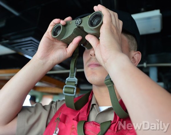 해군 제7기동전단 소속 한국형 구축함 왕건함 소속 한 병사가 지난 17일 오전 서해상에서 가상으로 NLL을 침범한 적을 격퇴하기 위해 총원 전투배치 훈련을 하고 있다.