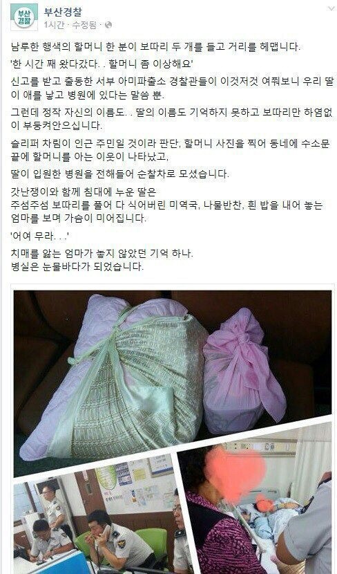부산 경찰이 전한 '치매 엄마의 보따리 안에는' 사연이 가슴 뭉클한 감동을 주고 있다.17일 부산지방경찰청은 페이스북에는 '치매를 앓는 엄마가 놓지 않았던 기억 하나'라는 제목으로 치매 할머니의 사연 소개돼 관심을 집중시켰다.부산 경찰에 따르면 남루한 행색의 할머니가 보따리 두 개를 들고 헤맸고, 신고를 받은 서부 아미파출소 경찰관들은 현장으로 출동했다.경찰이 할머니에게 이것저것 물어보니 할머니는 자신의 이름과 딸의 이름도 모른 채 "우리 딸이 애를 낳고 병원에 있다"라는 이야기만 하고 보따리를 껴안은 채 하염없이 울었다.당시 슬리퍼를 신고 있었던 할머니 차림새를 볼 때 인근 주민일 거라고 판단, 경찰은 할머니 사진을 찍어 아는 주민을 찾아 나섰다. 수소문 끝에 할머니를 아는 이웃이 나타났고, 6시간 만인 오후 8시쯤 할머니를 딸이 입원한 부산진구의 한 병원으로 안내했다.할머니는 갓난아기와 딸이 누워있는 침대에 보따리를 풀었는데, 그 안에는 출산한 딸을 위해 준비한 미역국과 밥, 반찬 등이 있었다. 할머니는 "어서 무라(어서 먹으라)"라고 말해 딸의 가슴을 미어지게 만들었다.부산 경찰은 "치매를 앓는 엄마가 놓지 않았던 기억 하나. 병실은 눈물바다가 되었습니다"라고 전했다.[치매 엄마의 보따리 안에는, 사진=부산경찰 페이스북]