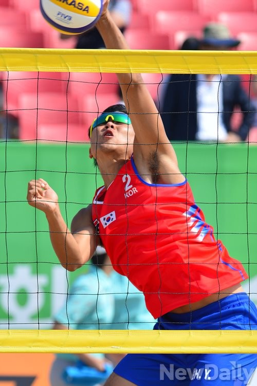 한국 남자 비치발리볼 팀이 20일 인천 송도 글로벌대학 비치발리볼장에서 열린 [2014 인천 아시안게임] 비치발리볼 남자 예선 D조에서 세트스코어 0-3 으로 홍콩에게 패했다.