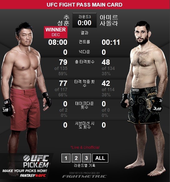 추성훈은 20일 오후 일본 사이타마 슈퍼 아레나에서 열린 'UFC 파이트 나이트 재팬'에 출전, 강타자 아미르 사돌라(34, 미국)를 맞아, 시종 우세한 경기를 펼친 끝에 심판전원일치 판정승을 거뒀다.