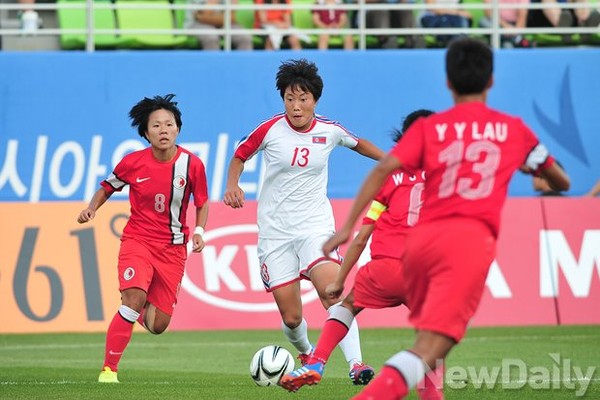 북한 여자 축구대표팀이 20일 오후 [2014 인천 아시안게임 여자축구 조별리그] 마지막 경기에서 홍콩을 5대0으로 꺾고 8강에 올랐다.이날 남북공동응원단의 응원을 등에 업은 북한은 전반 8분 13번 위정심의 선제골을 시작으로 후반전 4골을 몰아 넣으며 홍콩을 크게 무너 뜨렸다.