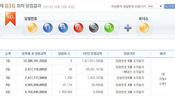 2014년 9월 20일 실시된 제616회 나눔로또 1등 당첨번호는 '5, 13, 18, 23, 40, 45'이며, 2등 보너스 번호는 3번이다.이번 로또 616회차 추첨 결과 1등 당첨자는 9명으로 16억1181만1250원의 당첨금을 받게 됐다.1등 번호 중개와 보너스 번호를 맞힌 2등은 49명이며, 1인당 4934만1161원씩 지급받는다. 당첨번호 중 5개를 맞힌 3등은 1700명으로 당첨금은 각 142만2187원이다.5만원의 당첨금을 받는 4개의 번호를 맞힌 4등은 8만1118명이며, 5000원의 고정 당첨금을 받는 5등은 135만809명이 나온 것으로 집계됐다.한편, 이번주 로또616 총 판매금액은 603억336만원이다.[로또616회당첨번호, 사진=로또 홈페이지 캡처]