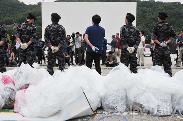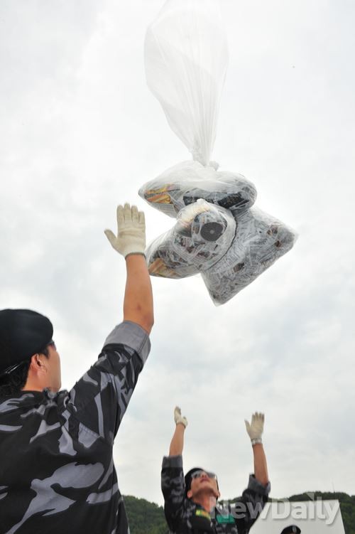 ◆ 대북 전단을 날린 이유는? = 대형 풍선 길이는 12m 정도다. 풍선은 원래 기계로 둥그렇게 만들어야 하지만, 자유북한운동연합은 예산을 아끼기 위해 비닐하우스 비닐 덮개를 가위로 잘라 2겹으로 만든다. 대형 풍선에 수소 가스를 넣으면 6,000m 정도 올라가서 북한으로 향한다. 일정한 시간이 지나면 터지도록 타임머신을 설치해뒀다. 동해 지역은 함흥 ·흥남까지, 서해 지역은 평양까지 날아간다고 한다.