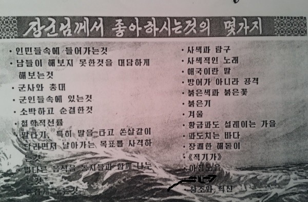 위대성 자료가 배포될 때마다 늘 그러하듯이 최근 '장군님께서 좋아하는 몇가지'라는 자료를 가지고도 '장군님처럼 살고 장군님이 좋아하는 것은 다 좋아해야 한다'는 식의 반 강요의 학습이 진행되고 있다.