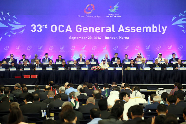 제33차 OCA(아시아올림픽평의회) 총회가 지난 20일 셰이크 아흐마드 알파하드 알사바 OCA 회장과 토마스 바흐 IOC회장을 비롯해 NOC 대표단, OCA 집행위원, IF/AF(경기연맹), 전․차기 아시아경기대회조직위 대표단과 OS(올림픽 솔리다리티), 옵서버 500여명이 참석한 가운데 인천 송도컨벤시아에서 개최됐다.