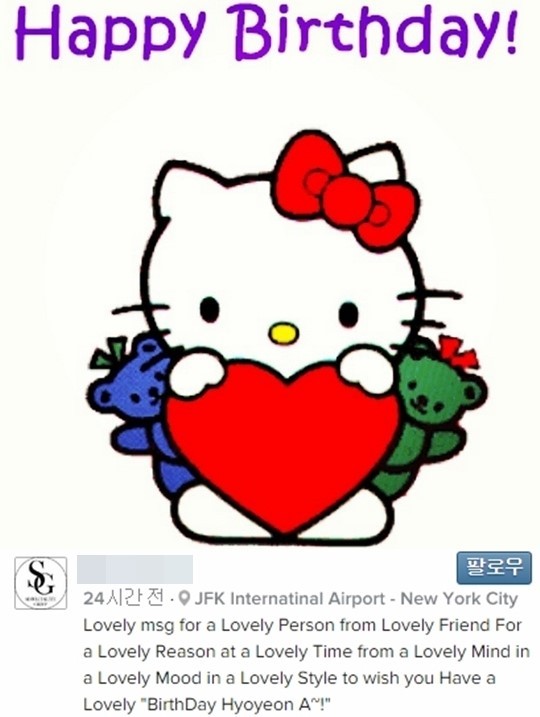 과거의 연인에게 생일 축하 메시지를 보낸다? 그것도 공개적으로 누구나 볼 수 있는 SNS에? 아무리 쿨하게 헤어졌다하더라도 이전 연인에게 생일 축하 메시지를 보내는 일은 결코 쉬운 일이 아니다. 따라서 다수의 네티즌은 '두 사람이 다시 사귀는 것 아니냐'는 의심의 눈초리를 보내고 있는 상황.Lovely msg for a Lovely Person from Lovely Friend For a Lovely Reason at a Lovely Time from a Lovely Mind in a Lovely Mood in a Lovely Style to wish you Have a Lovely BirthDay Hyoyeon A~!